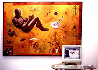 BRAHMA’S HOME PAGE Multiple media Installation. Acrylic on canvas, HTML interface on computer Dimensions- 48” X 72” Baiju Parthan, 1999 |